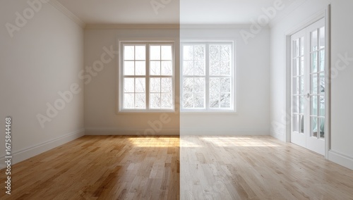 interior, room, empty, window, light, shadow, sunlight, daylight, flooring, wooden, white, pale, modern, minimalist, home, apartment, design, architecture, visualisation, rendering, perspective, empty space, clean, bright, warm, cool, contrast, symmetry, natural, illuminated, unoccupied, furnished, blank, decor, winter, cold, frost, snow, exterior, simple, uncluttered, roomy, vacant