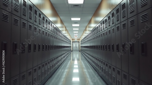 Empty school hallway with symmetrical metal lockers, leading to a vanishing point under soft fluorescent light.