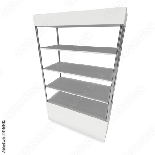 Empty showcase with glass shelves for exhibit. 3D render illustration isolated on white background. Trade show booth blank pedestal for expo design.