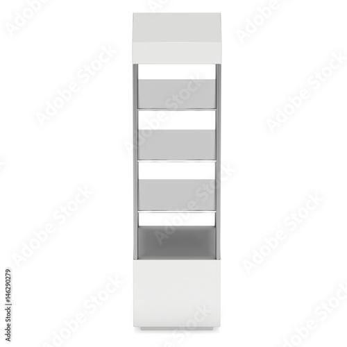Empty showcase with glass shelves for exhibit. 3D render illustration isolated on white background. Trade show booth blank pedestal for expo design.
