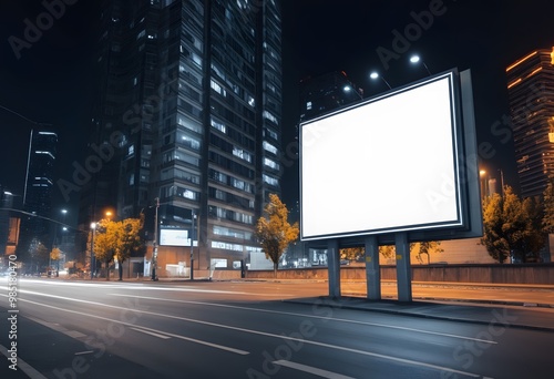 Empty space advertisement board, blank white signboard on roadside in city, Square blank billboard in city in night time