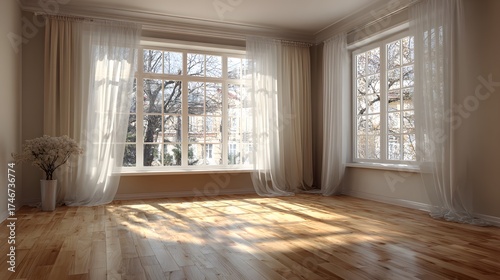 Empty, spacious room with light beige walls and a beautiful light oak floor. Soft, diffused light from a large window creates a calm, airy feel.