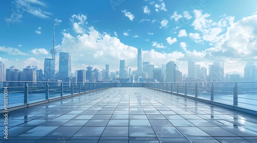Empty square floor and bridge with city skyline under blue sky : Generative AI