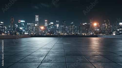 Empty square floor at night, with a vibrant city skyline in the background, lights illuminating the view.