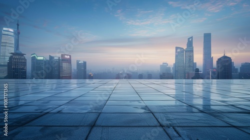 Empty square floor with city skyline background, Modern cityscape with spacious square, evening glow