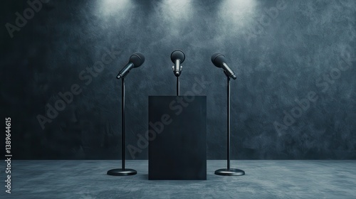 Empty stage setup with three microphones and podium in a dramatic spotlight for presentation or conference event