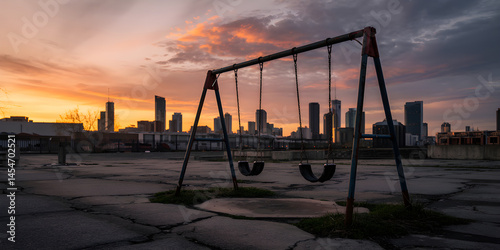 Empty Swingset Silhouette: A serene, cinematic moment unfolds as an empty swing set stands silhouetted against the dramatic backdrop of a city skyline and a breathtaking sunset.