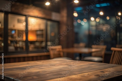 Empty tabletop in the coffe shop at night over defocused background with copy space