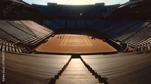 Empty tennis stadium with clay court and tiered seating under sunlight
