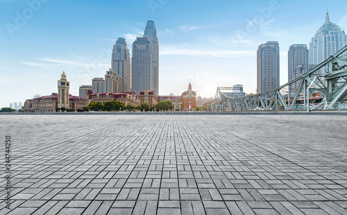 empty tiled floor and urban skyline,tianjin china.