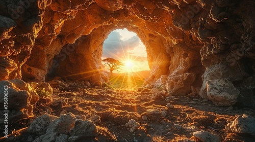 Empty tomb with stone rocky cave and light rays bursting from within. Easter resurrection of Jesus Christ. Christianity, faith, religious, Christian Easter concept