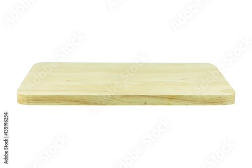 Empty top of wooden shelf isolated on white background. For prod
