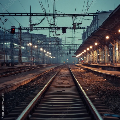 loneliness, night, mood, linear, departure, empty, platform, silence, abstract, perspective, shadow, architecture, railroad, train track, arrival, light, infrastructure, city, horizon, travel, railroad station, evening, composition, metal, transportation, atmosphere, minimalism, journey, industrial, geometric, urban, steel, railway, waiting, dark