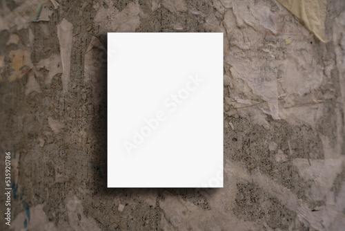 Empty vertically fixed on shabby concrete wall white poster with mockup space
