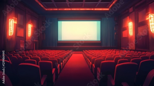 Empty vintage movie theater seats and screen. Ideal for film, cinema, or entertainment projects.
