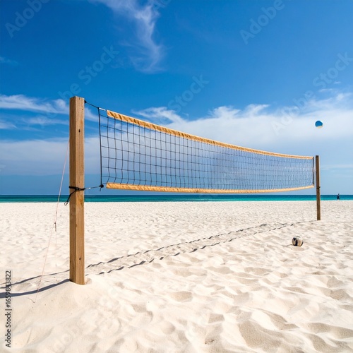 Empty volleyball net on a sandy beach with a tropical landscape