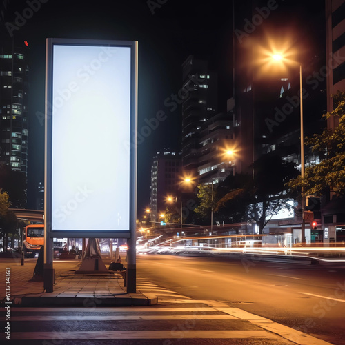 Empty white blank billboard digital sign poster mockup on urban street at night for advertising, marketing