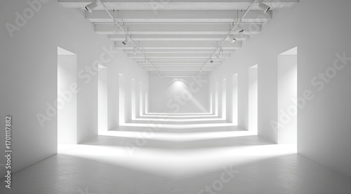 architecture, interior, gallery, hallway, white, light, empty, modern, minimalist, space, design, clean, bright, illuminated, concrete, ceiling, beam, illumination, perspective, depth, long, straight, wall, door, window, sharpened, symmetry, geometric, industrial, simple, contemporary, open, wide, shadow, ray, spotlight, abstract, future, architectural