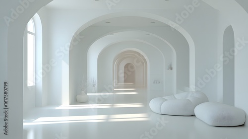 Empty white hallway with arched ceilings and modern seating.