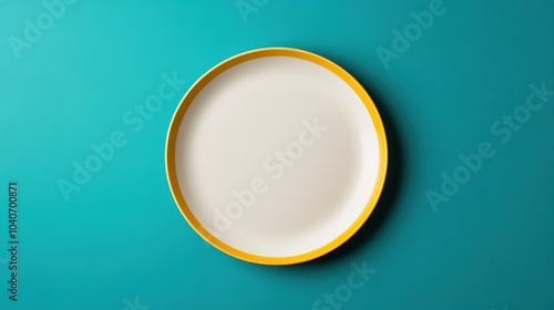 Empty white plate with yellow rim on a turquoise background. Minimalist and modern design concept