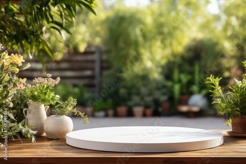 Empty, white podium against the background of a green store with flowers in pots, against a background of greenery. Concept for presentation and demonstration of a product, montage