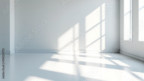 Empty white room, white walls, white floor,Minimalist white room with sunlight streaming through windows