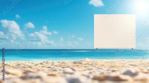 Empty White Sheet of Paper Laid on Soft Sandy Beach with Gentle Waves Lapping at the Shore Under Clear Blue Sky