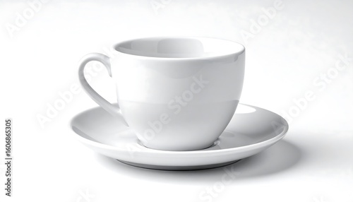 cup, saucer, tea, white, porcelain, empty, ceramic, hot drink, breakfast, crockery, tableware, kitchen, home, clean, simple, elegant, smooth, glossy, round, handle, plate, minimalist, studio, still, life, photo, isolated, bright, light, shadow, product, display, whiteware, modern, cleanliness, style, table, dish, set, object, design, background