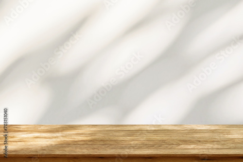 Empty wood table top on beige wall texture with tree leaves shadow background