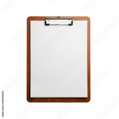 Empty wooden clipboard with a blank white paper sheet. Ideal for displaying text, forms, or checklists in a professional or educational setting.