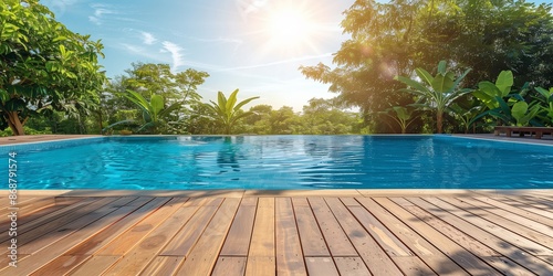 Empty wooden deck with swimming pool