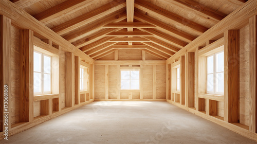 Empty wooden house interior with beams and sunlight through windows, architecture and construction concept highlighting design, structure and space.