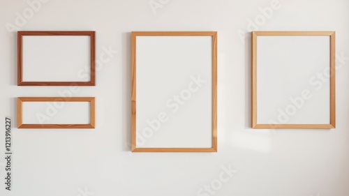 Empty wooden picture frames on a white wall, ready for your artwork or photographs