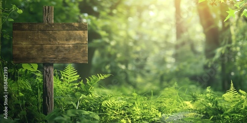 Empty wooden signboard standing amidst a dense green forest, surrounded by lush ferns and illuminated by soft sunlight filtering through the canopy.