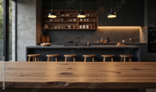 Empty wooden table in blurred modern kitchen, illuminated evenly by natural light to bring out its rich texture.