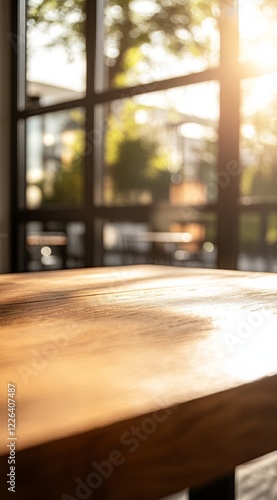 table, wood, wooden, cafes, hot drink, eatery, sunlight, sun, window, glasses, interior, empty, space, background, texture, surface, design, room, light, bright, warm, shadow, day, morning, afternoon, view, green, tree, plant, bokeh, blurred, sharpened, clean, modern, style, top, product, display, showcase, counter, bar, desk, brown, gold, shine