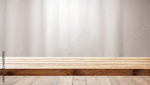 Empty wooden table in front with blurred white background