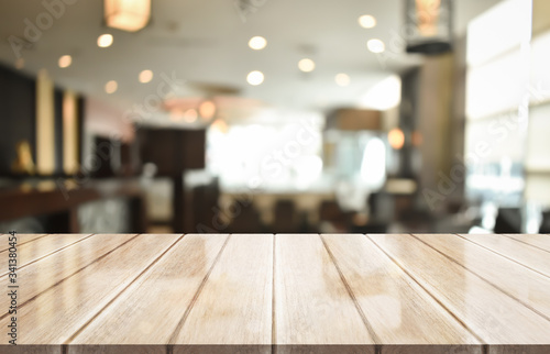 Empty wooden table top with lights bokeh on blur restaurant background, 3D Rendering