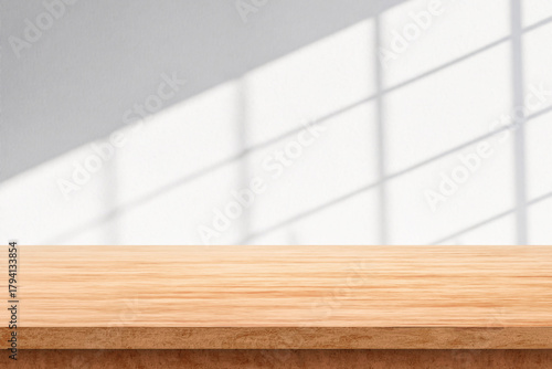 Empty Wooden Table with Soft Window Light on White Wall