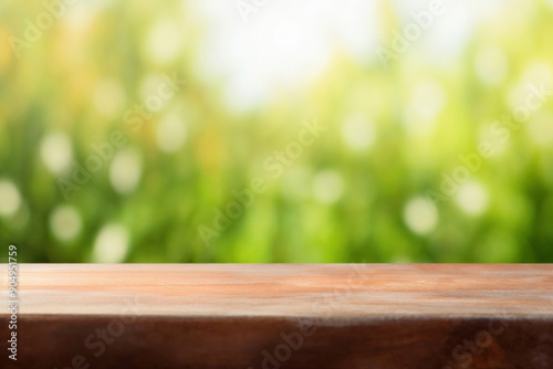 Empty wooden tabletop with blurred green nature background, ready for product display montage
