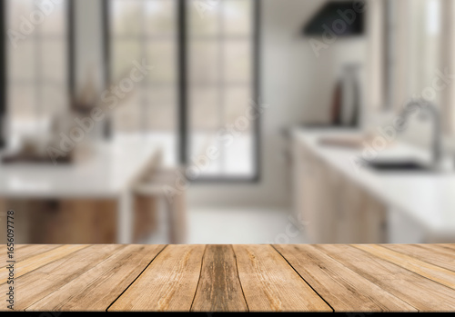 Empty wooden top table with blurred kitchen interior Background. for product display