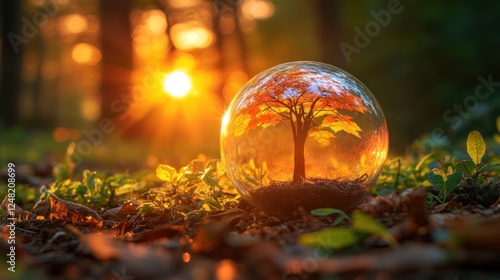 tree, nature, autumn, sunset, forest, glasses, orb, sphere, miniature, earth, magic, enchanted, fall, leaf, colours, gold, sun, light, ground, plant, dirtied, earth, landscape, photo, image, art, scene, environment, eco, ecology, botanical, flora, foliage, shrub, green, orange, yellow, red, brown