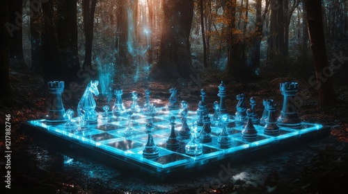 surreal, board game, blue, abstract, photorealistic, enchanted, render, dark, fantasy, game, fantasy art, night, glowing, mystical, three-dimensional, digital artwork, dreamlike, artwork, forest, ancient, magic, chess, castle, illustration