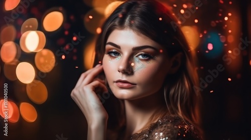 woman, portrait, face, model, girl, beauty, fashion, female, make-up, eye, hair, skin, glamour, glistering, sparkle, light, bokeh, night, evening, dark, gold, dress, elegant, stylish, attractive, radiant, gorgeous, pretty, charming, alluring, captivating, mesmerizing, dazzling, aglow, photographic, studio, lighting, image, photo, style