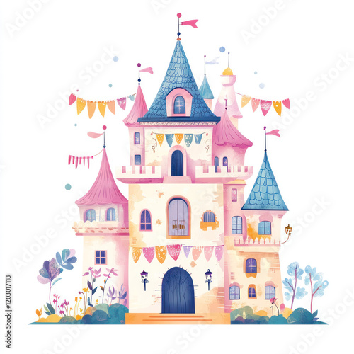 castle, illustration, fairy tale, whimsical, palace, festive, flag, tower, bunting, magical, fantasy, dreamlike, colourful, pink, blue, architecture, building, storybook, artwork, art, design, cute, charming, romantic, pretty, decorative