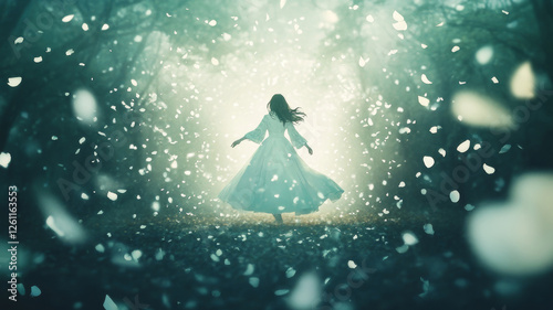 woman, dress, forest, flower petals, magical, dreamy, fantasy, whimsical, mysterious, serene, peaceful, tranquil, light, nature, fairy tale, enchanted, aethereal, spiritual, flowing, dance, motion, graceful, beauty, elegant, soft, gentle, romantic, artistic, photo, image, vision, wonderland, illusion, art, creative, atmosphere, scene, environment, surreal, poetic, mystical