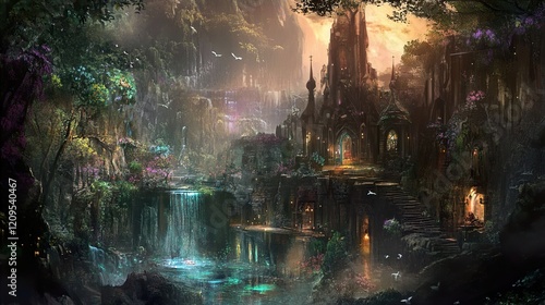 castle, waterfall, forest, fantasy, magical, enchanted, tree, rock, water, lake, flower, plant, architecture, building, stone, path, stair, dark, light, mystery, hidden, secret, dreamlike, surreal, scenic, beautiful, serene, peaceful, tranquil, calm, lush, green, vibrant, colours, texture, detail, atmosphere, mood, setting, environment, earth, nature, art, digital, painting, illustration, artwork, design, graphic