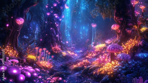 forest, path, mushroom, tree, glowing, magical, fantasy, enchanted, luminescent, mystical, neon, purple, pink, blue, orange, yellow, light, night, dark, scene, nature, surreal, artwork, digital, art, vibrant, colourful, stream, water, plant, flora, fungal, alien, dreamlike, aethereal, sparkling, glittering, mysterious, tranquil, serene, peace, beauty, wonder