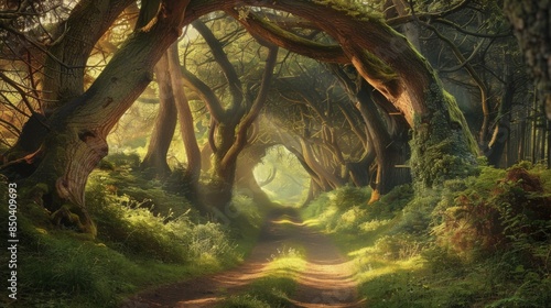 forest, path, mystical, lighting, twisted, tree, fantasy, nature, enchanted, archway, green, mystery, serene, wood, magical, adventure, scenic, beautiful, landscape, natural, sunlight, shadow, journey, dreamlike, calm, tranquil, imaginative, peaceful, foliage, wilderness, nature scene, enchanted forest