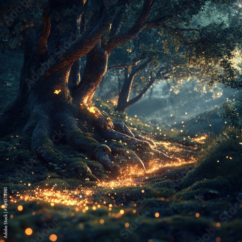 enchanted, forest, pathway, gold, light, magical, dawn, tree, root, glowing, mystical, nature, serene, tranquil, aethereal, fantasy, timberland, sunlight, shadow, foliage, atmosphere, dreamy, mystery, landscape, peaceful, natural, environment, beauty, wonder, captivating, aglow, sparkle, morning, tree, branch, green, enchanting, imagination, picturesque, scenic, surreal, inspiration, relaxation, calm, adventure, journey, serenity